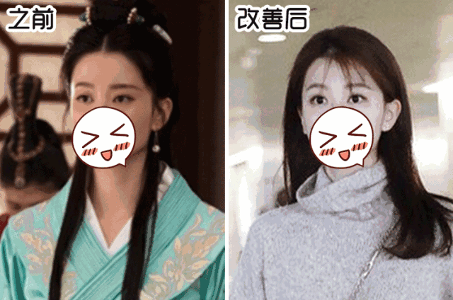 之前的眉毛细且位置偏高,导致眉眼间距大,眉毛之间距离远,眼神更加涣散。而现在的眉毛适当加粗,位置靠近眼睛,眼间距变小,一定程度上改善了瞳距宽带来的眼神涣散感。