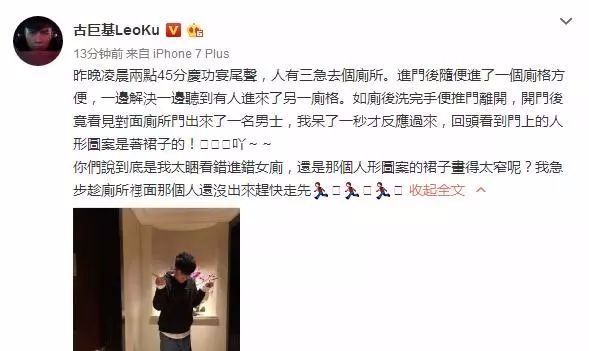 就在刚刚几分钟前,古巨基发微博称因为庆功宴的原因,喝了不少酒,结果进错厕所,闹了很大的笑话,具体的事情,我们接着往下看