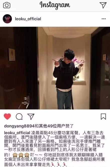古巨基还在厕所门口照相留念下,以后喝酒的时候,看看照片,提醒自己千万别走错了,下次让哪个大妈误认为是色狼,那就崩溃了,顺便也给古巨基点赞,让大家开心的度过了这一天。