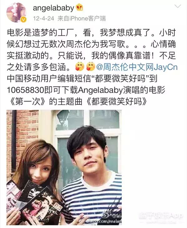 2012年周杰伦为baby做了一首歌,是电影《第一次》的主题曲叫《都要微笑好吗》,当时的baby还拿着周董的几张专辑,娇羞的和周董合了影。