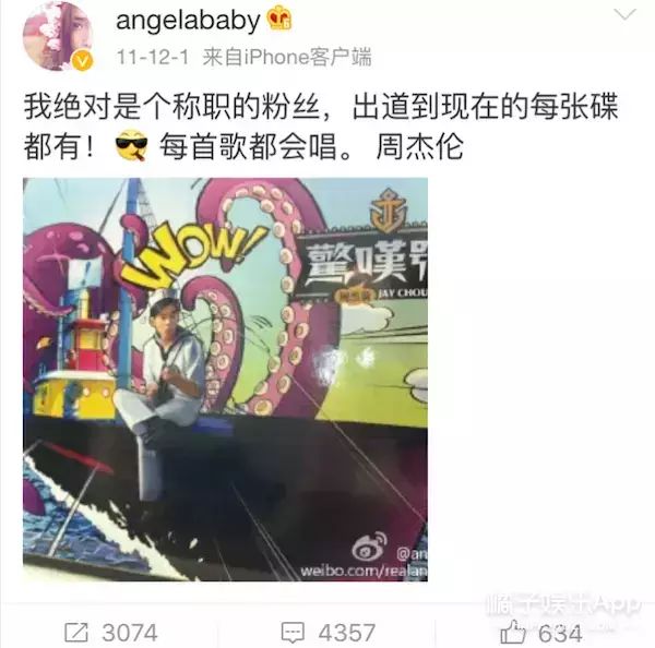 如果说权志龙是baby的新欢,H.O.T是baby的初恋,那么baby的本命就是周杰伦了!在Angelababy的微博搜索“周杰伦”三个字,就出来了5条相关消息,每一条都代表了偶像对粉丝的意义。