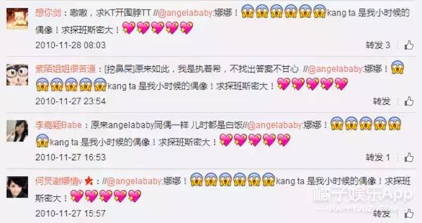 当时谢娜在和安七炫拍一部叫《辣椒与泡菜》的剧,baby不只一次给谢娜留过言,说Kangta(安七炫)是小时候的偶像,希望娜娜好好照顾他还求探班。