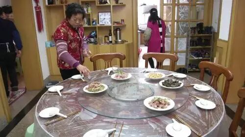 刘春贵说,今儿请的都是自家人,家宴特别丰盛:一共是四个炒菜,十个冷盘,再加八个烧菜,包括烧老鹅、牛肉等扬州特色传统菜。妻子李凤云说,虽然要忙这么多菜,但是忙得开心,家里每年过年都是这样。