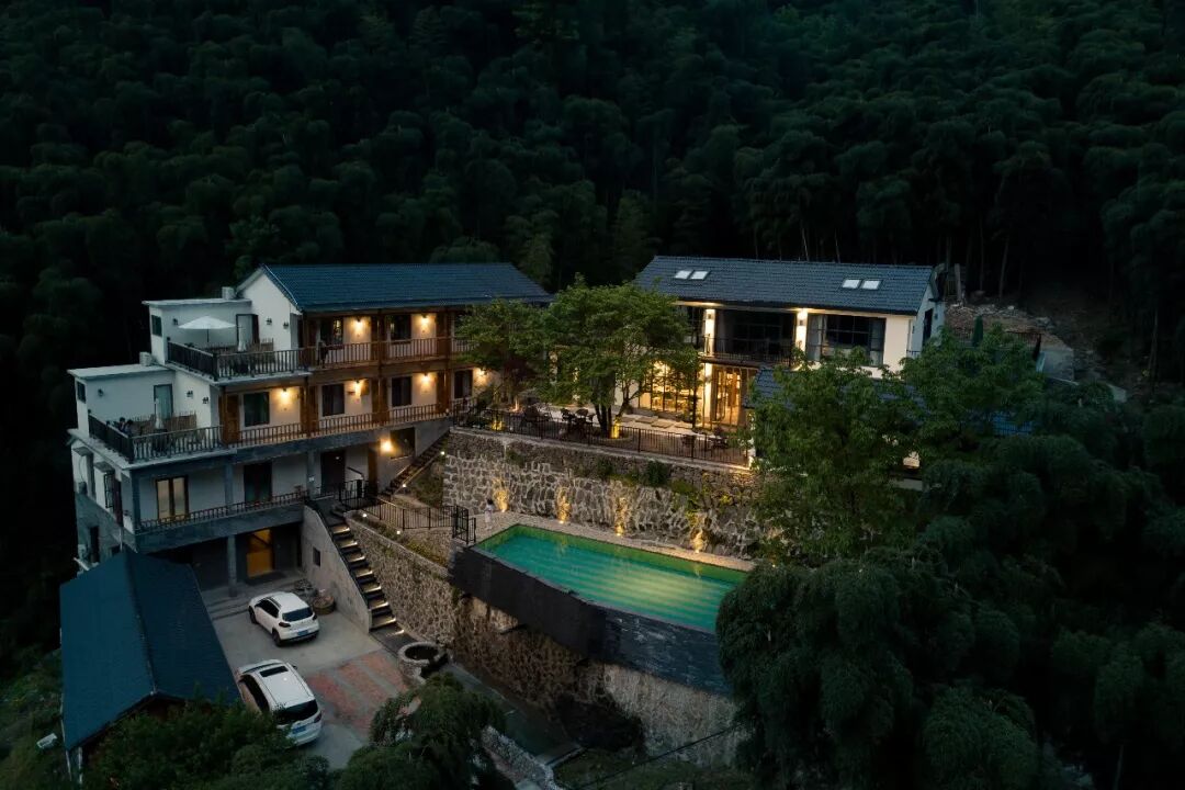 车行到龙王山的山腰处,两幢灰瓦小白楼静静伫立,石头围墙里是一汪无边泳池。