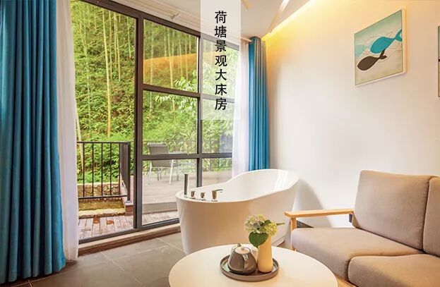 荷塘景观大床房,靠山一个大浴缸,独享一个阳台,连收纳柜每个抽屉都是不同色。