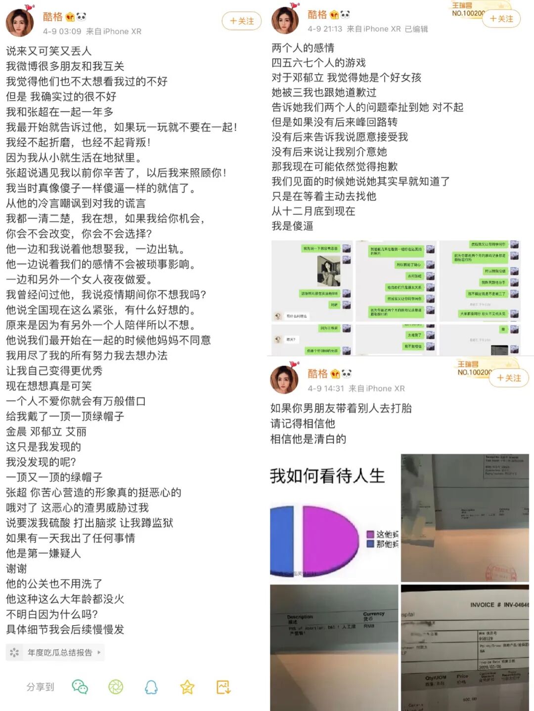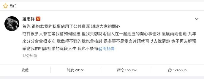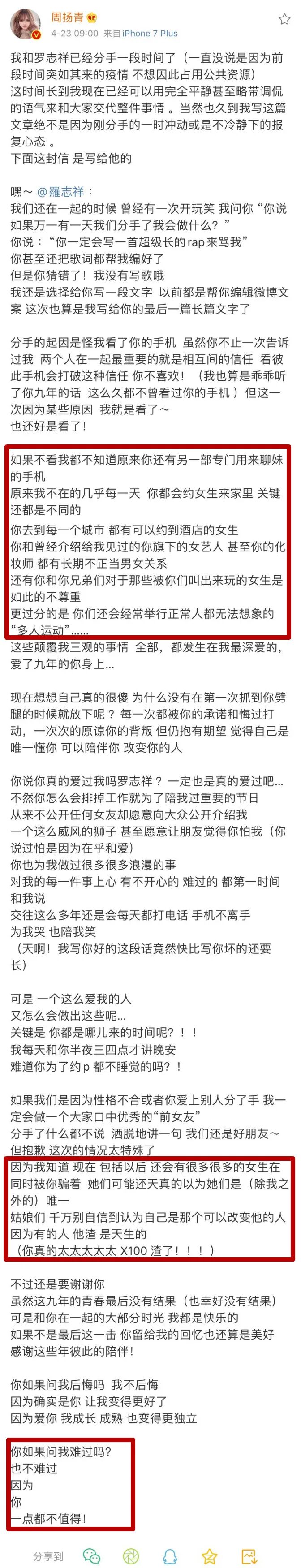 罗志祥劈腿、约炮、群P被分手:告别渣男,是女孩一生的必修课! 南木大叔 港台男星 2020-04-23 12:46:33 811 创作不易,用心坚持,欢迎请BaGua喝几杯爱心咖啡!打赏并支持本文 打赏并删除本文 一个女孩的9年青春能换来什么?周扬青告诉你,能看清一个渣男!今天上午,周扬青发表长文,宣布与罗志祥9年感情正式终结。令人震惊的是,这场恋爱长跑的结束不为别的,而是因为被罗志祥“骗”了九年的周扬青发现,原来自己深爱了9年的男人在和她交往的同时,还有一部专门用来撩妹的手机;原来自己不在他身边的时候,他几乎每天都会约不同的女孩来家里;原来他和自己身边的工作人员存在诸多不正当的男女关系;原来,在她看不见的时候,他甚至还会约人来做正常人无法想象的“多人运动”……紧接着,罗志祥中午发表回应,避重就轻、不咸不淡的几句话便抹去二人九年来经历的一切风雨。九年青春,一腔真心,无条件的信任,终究是错付了。如果不是执意看了对方的手机,周扬青或许现在还活在罗志祥为她编织的梦里,相信不久的将来自己会成为幸福的罗太太。毕竟,九年的回忆太多,曾经的承诺太坚定。2015年,罗志祥周扬青被拍到穿情侣装同游日本,更被爆出两人从2011年开始就已经在交往,随后两人正式承认恋情,五年里,为粉丝撒了无数的蜜糖。罗志祥曾在节目里坦言周扬青是自己理想的结婚对象,两人是“以结婚为前提”在交往;罗妈妈也不止一次公开赞扬自家媳妇温柔贤惠,甚至有人爆料周扬青已经改口喊“妈妈”。他们曾经认真地相爱过。她包场请粉丝看他主演的电影,大方表白“为你做一切事情我都开心”;他不止一次在纪念日和她生日时高调送祝福,在录制节目提到女友时满脸的骄傲与幸福。他们也像正常的情侣一样,用情侣物品、逛街合影、拍好笑甜蜜的视频、牵手走遍这个世界的每个角落。点点滴滴相爱的印证仿佛就在昨天,罗志祥混乱的私生活犹如当头一棒,重重地打在周扬青的心上。要有多大的勇气才能为一个人付出九年的青春?要有多深的爱意才能在经历过对方的无数次劈腿后还默默选择隐忍和原谅?周扬青说,“为什么没有第一次抓到你劈腿的时候就放下呢?一次次原谅背叛,抱有期望,觉得自己是唯一懂你、可以陪伴你、改变你的人”,这么多年她终于醒悟,不是每个人,都值得相信。这场九年的梦醒了,她选择斩断曾经视若珍宝的回忆,放下对他的依恋和不舍,用这一场漫长的痴心错付,换来今后的果断和清醒。善恶终有报,玩过火的人,是无法一手遮天的。试问一个女生的青春,能有多少个九年?就在不久之前,演员张超的女友连发数条微博曝光了他恋爱期间的恶行。据张超的前女友说,在与张超恋爱的一年多时间里,他劈腿约炮、同时与四五个女孩纠缠不清。更让人愤怒的是,每个与他有关系的女孩都以为自己是他的唯一,直到真相大白,才知道不过是痴心错付。“他一边说的想娶我,一边出轨;一边说着我们的感情不会被琐事影响,一边和另外一个女人夜夜做爱”;“说要泼我硫酸,打出脑浆,让我蹲监狱”;“让别的女孩为你半年吃三次紧急避孕药”“上一秒陪着别人打胎,下一秒说想我”……字字句句,绝望而刺眼,杀人诛心。渣男是没有心的。他们欺骗一个女孩的时候,连眼都不会眨一下。去年,网红阿沁手撕渣男引爆热搜的事还历历在目,她将自己交往了五年的男友刘阳与小三半藏森林的劈腿实锤一一爆出,宣布就此结束与刘阳的恋爱关系。她18岁和他在一起,一起吃苦,一起创业,一起经历生活的确幸和坎坷,她买好了婚房,只要他开口便随时嫁人,她借钱给他创业,在他迟迟不愿给她未来的时候选择相信和等待。可这一腔热情换来的是什么呢?是眼睁睁地看着自己的男人,和另一个人去酒店开房、对另一个人深情表白,是听到自己深爱的男人说出“我摸你就像在摸我自己”。终于,她用自己最好的五年,看清了曾经最爱的男人。多年的陪伴突然抽离,承受背叛的撕心裂肺,看着他与别人浓情蜜意的痛彻心扉,没有经历过的人无法感同身受。对于这些受害者而言,这一切都不会轻易过去,渣男毁掉的不仅是一段真诚的感情,更是一个女孩对爱的憧憬,对未来的信心。可以不爱,但不要伤害。一腔真情错付的女生有多惨?她们从未想过给自己留后路,却发现原来自己只是对方精彩情史中的过客一位。屈楚萧和万籽麟被拍到亲密相拥,在没有告知女友的情况下矢口否认,称“没恋爱,别挡了姑娘的好姻缘”,万籽麟随即回应“刚刚得知自己被分手了,谢谢大家关心”;陈奕辰在曝光女友私生活的音频后撇清自己,宣布“暂停恋爱关系”;孔维在和诗苑相恋十年后表示“自己一直没有做过太多跟她未来的设想”;陈翔在被女友捉奸在床后声明“当事人最清楚这段感情的珍贵与纯粹”……无数的渣男语录警醒着我们,遇到渣男,及时止损,别再傻乎乎地相信他们的甜言蜜语,一个连道德底线都可以弃之不顾的人,不值得任何一个姑娘为他倾力付出。知乎上有一个话题是,“分手会让人变得更好吗?”其中一个高赞答案说,“会的。之前谈恋爱会占用生活大部分时间,只习惯了爱别人。单身后,我有了大把时间去爱自己,去做之前想做但没有时间做的事情。这些都是我独身后学到的新本领。分手能让我有时间分给我的朋友家人,让我重新审视自己身上的优缺点。”姑娘们,遇到错的人不可怕,请