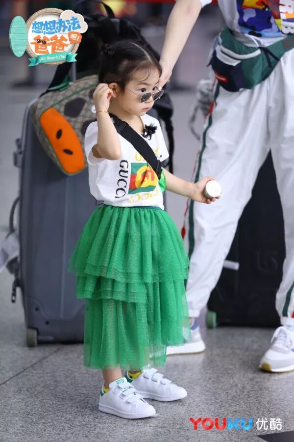 戚薇是时尚界杠把子,那么小Lucky在时髦这方面也毫不逊色。身穿T恤搭配绿色薄纱蛋糕裙,脚踩小白鞋,戴上小墨镜超级酷炫。