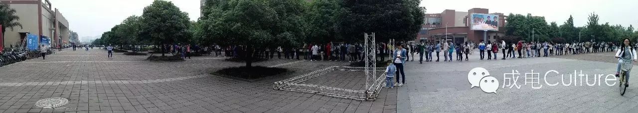 从正式前进场两个多小时开始排队、成电会堂三人两座、两旁过道上站了许多人、中间的走道上也可见席地而坐的同学……