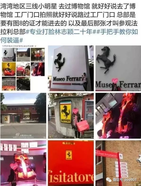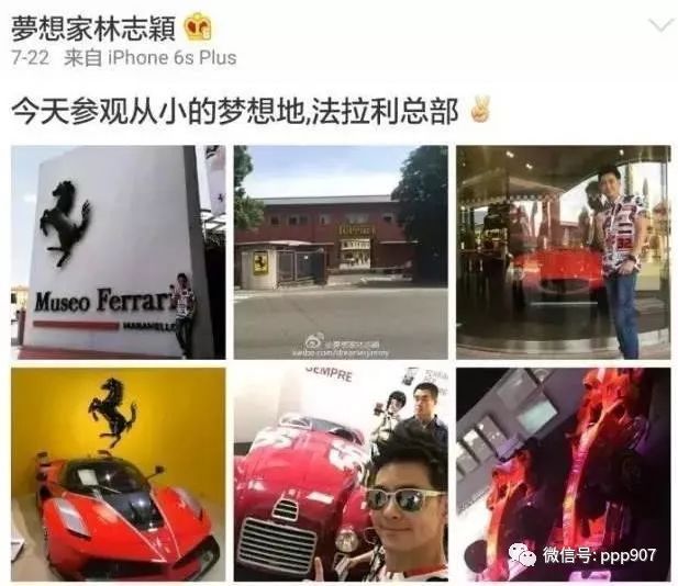 早年林志颖在网上上晒出了自己去法拉利总部参观的照片,谁知道没多久就有网友指出林志颖参观的只是博物馆而已,更不不凑巧的是科比也在同一时间去了法拉利的总部,而且看起来确实跟林志颖去的不是一个地方,只是说他的牛皮吹的太大了!