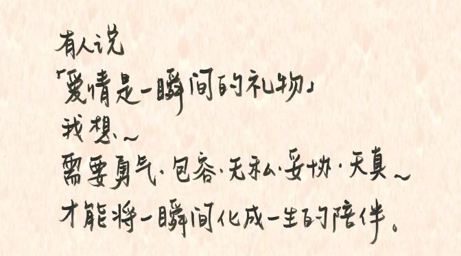 “有人说,爱情是一瞬间的礼物。我想,需要勇气、包容、无私、妥协、天真,才能将一瞬间化为一生的陪伴。”