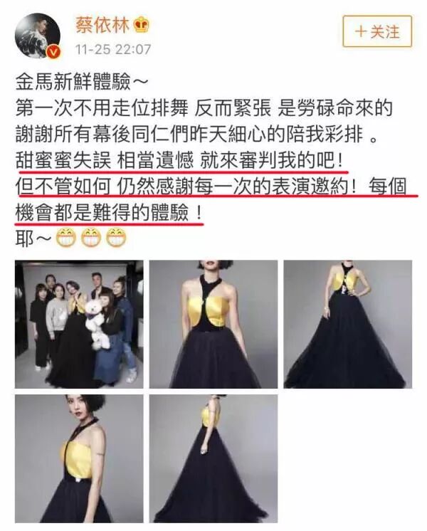 蔡依林到底是天后,场面见很多。演出结束不到半小时,她就在微博留言说——“甜蜜蜜失误 相当遗憾 就来审判我的吧!”⤵️⤵️