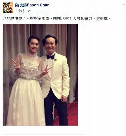 “车祸”之后,陈奕迅也是第一时间在微博发文说:“谢谢金马奖、谢谢丞琳!大家都尽力。你很棒。”