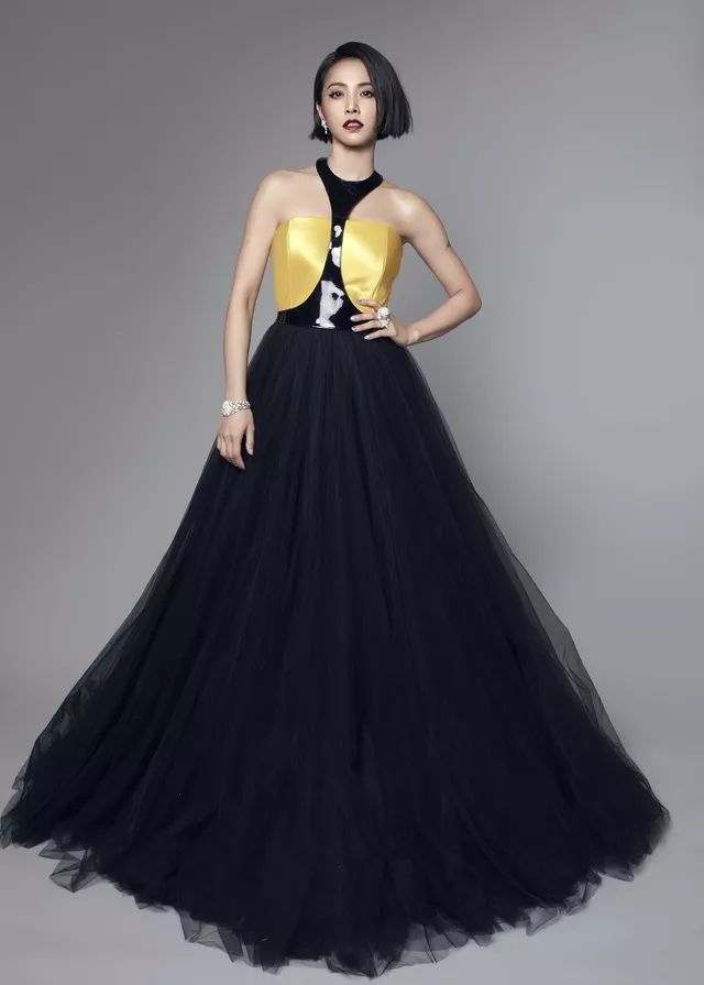 演出的行头也是“暗藏心机”——漆皮露肩晚礼服。⤵️⤵️