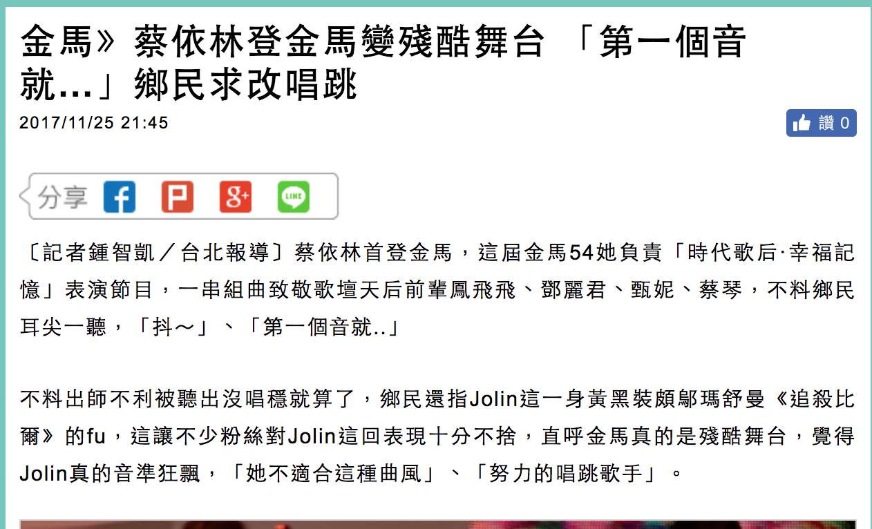 但是呢,蔡依林和林俊杰在今年金马奖的表现就被台湾“乡民"(台湾最大在线互动论坛PTT)形容为“双J金马落难记”。