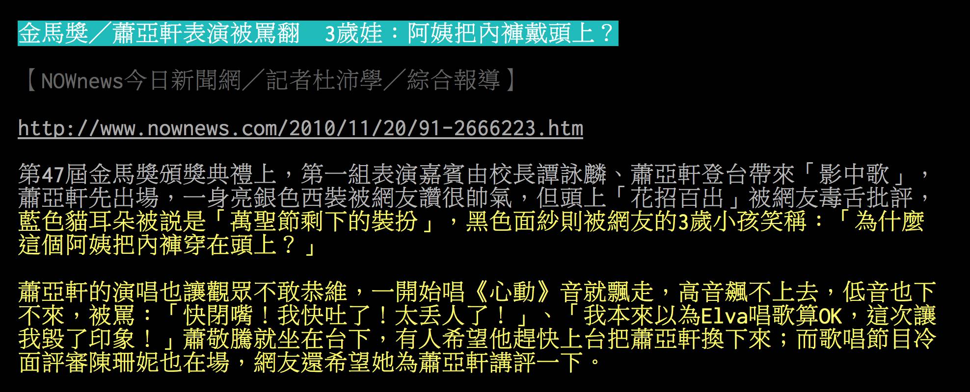 同样是在金马奖上表演组曲联唱,2010年前萧亚轩也在演唱时音飘抢拍。而且,她的造型当年还被网友各种批评,被呛“为什么这个阿姨把内裤穿在头上”……