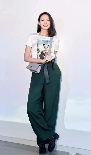 张梓琳的这一套搭配就是利用了白色与深绿色的相互映衬。腰带的设计让她的腰部看起来更加盈盈一握,而阔腿裤的设计则为它增添了一股青春时尚的气息。