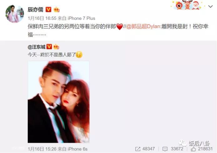 好兄弟郭品超、辰亦儒随后转发祝福,为恋情盖了章。