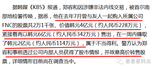 根据韩媒的说法:郑容和通过倒卖股票赚取了人民币114万,属于不当得利,很可能是事先了解过相关情报故意高价转出的↓