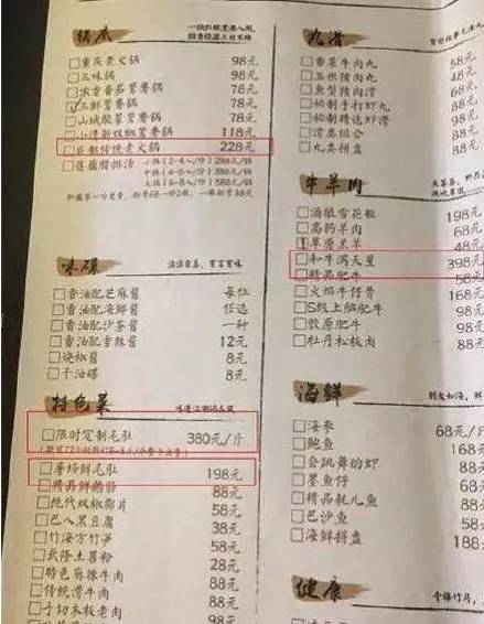一个叫“猫大舒”的网红说,当天他们三人点了一个128块的鸳鸯锅,定制毛肚一斤380元,15片牛肉398元。最后花了1500多元,人均消费500多。