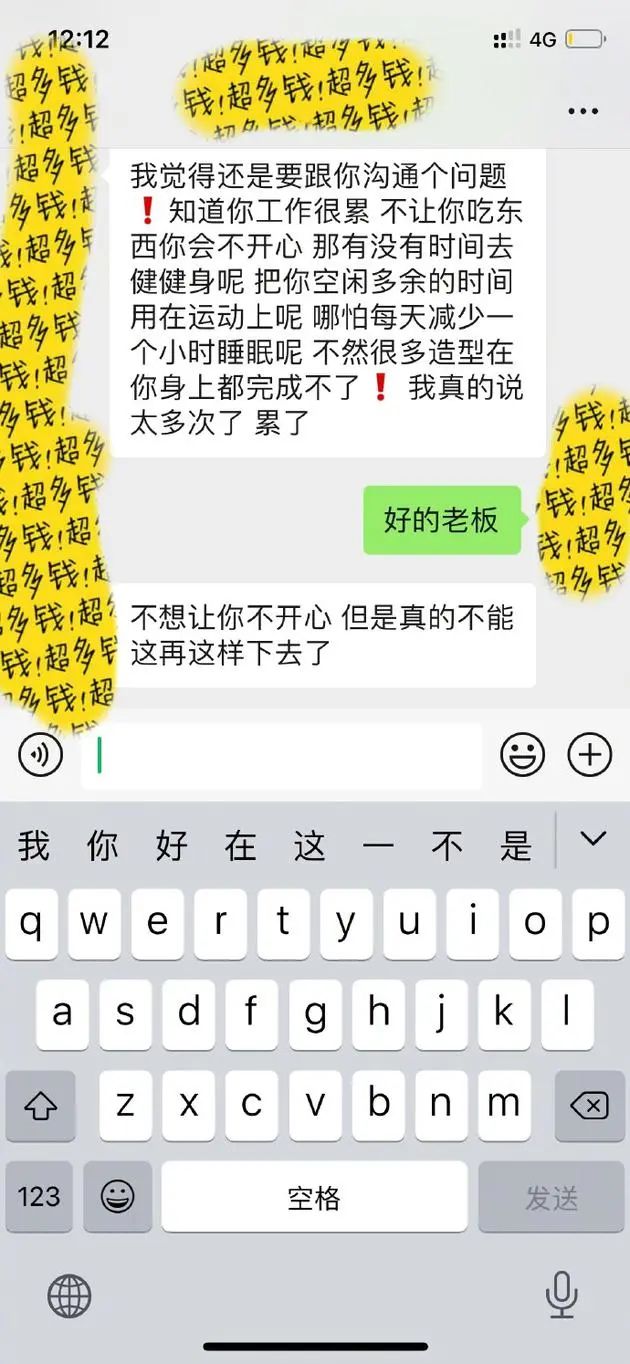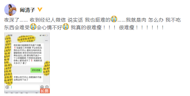 9月10日凌晨,阚清子在社交平台上晒出经纪人与自己的聊天对话截图,并表示:“夜深了……收到经纪人微信。说实话,我也挺难的……我就是肉,怎么办。我不吃东西会难受,会心情不好,我真的很难瘦!很难瘦!”