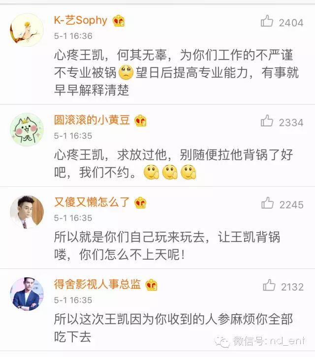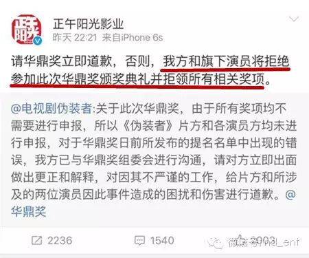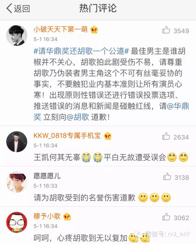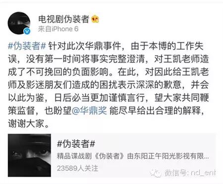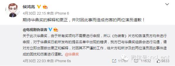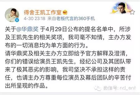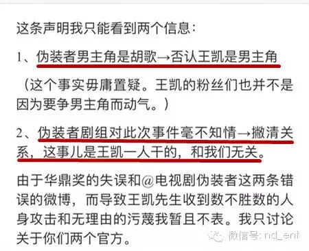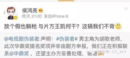 华鼎奖摆的乌龙,让胡歌、王凯、《伪装者》都躺枪了…… 内地男星 2016-05-01 22:33:57 162 创作不易,用心坚持,欢迎请BaGua喝几杯爱心咖啡!打赏并支持本文 打赏并删除本文 南都全娱乐(微信号:nd_ent)原创作品,未经许可禁止转载。本文仅代表作者观点,不代表南都立场五一劳动节,娱乐君原本想今日停更,给自己放一天假好好歇着……结果,一场连续剧似的“粉丝大战”,按下葫芦浮起瓢,不停的“神转折”……让娱乐君没法停下来……这是因为4月30日晚,第19届华鼎奖公布提名名单,王凯凭借《伪装者》获“最佳男主角”提名。纳尼?王凯什么时候变成《伪装者》的男主角了?看简介↓看官方海报↓事情本来很清楚,华鼎奖出错,引发胡歌、王凯双方粉丝不满,华鼎奖该澄清澄清、该道歉道歉也就对了。然而,由于华鼎奖一直不发声,从4月30日晚到5月1日下午,引发了一场粉丝大战,将华鼎奖、胡歌、王凯、伪装者官微、正午阳光和唐人全都“拉下了水”,最终将#道歉 伪装者#这个话题拱上了新浪微博热搜榜第一。一出连续剧似的粉丝大战,而且还有愈演愈烈之势。可是,道歉的也应该是华鼎奖啊?关“躺枪”的伪装者何事?事情是这样开始的——1、华鼎奖出错,“胡椒”炸了第19届华鼎奖中国百强电视剧满意度调查奖项公布提名名单,王凯凭借《伪装者》获最佳男主角提名。由于《伪装者》的男主角是胡歌,华鼎奖的提名名单引发了网友不满,有“胡椒”(胡歌粉丝)质疑,《伪装者》和王凯“篡改”男主角。2、伪装者澄清,“王妃”炸了为了澄清此事,伪装者官方微博发表声明:“《伪装者》男主角为胡歌老师,此次华鼎奖提名奖项并非剧方申报,我们正在积极联系华鼎奖,还望主办方妥善处理。”这本来是个再正常不过的声明,澄清谁是男主角,澄清不是《伪装者》官方申报的奖项。“胡椒”们对这个声明算是满意了,但没想到事情迅速向另一个方向发展。网上出现个别言论,影射王凯没有资格角逐“视帝”,暗示是不是王凯方面自己去申报的奖项。3、“王妃”手撕伪装者官微后续发展也“越走越远”,部分“王妃”们(王凯粉丝)跑到伪装者官微下面留言,指责官微忙着帮“别人”澄清,不顾自家艺人。对于伪装者官微的那条澄清微博,有王凯粉丝是这样理解的。↓↓↓她认为,伪装者官微是在“撇清关系,这事儿是王凯一人干的,和我们无关”……还有王凯粉丝认为:“是由于华鼎奖的失误和伪装者官微的微博,导致王凯收到数不胜数的人身攻击和无理由的污蔑。另外,伪装者官微在澄清同剧组的演员胡歌先生后,却没有澄清也是剧组中的王凯先生。使胡歌先生的粉丝将怒火全部转向王凯,王凯遭到谩骂和人身攻击。因而,@电视剧伪装者也需要为此事负起应该有的责任,并公开道歉。”作为路人的娱乐君,其实对于这个逻辑始终有点儿云里雾里。因为理论上,伪装者官微只是剧方官微,并不是王凯工作室的官微,它客观陈述谁是该剧的男主角并没有错。因为能代表王凯发言的只有王凯本人及其工作室。王凯如果因此事遭到了攻击,不应该是“谁造谣、去撕谁”么?“谁攻击、去撕谁”么?又关伪装者官微何事?4、侯鸿亮“补锅”,双方“炸”了然而,事情居然还没有完。正午阳光的董事长侯鸿亮发微博“补锅”:“放个假也躺枪,与片方王凯何干?这锅我们不背。”下面的评论分成两边倒:“王妃”们继续指责是“伪装者官微”导致了王凯“躺枪”,“胡椒”则又误会了,表示这句话的意思会让人误会为“这锅该由胡歌和胡椒们背”……真是越补越糟糕,双方永远都摆不平了。5、官方纷纷卷入,华鼎奖继续“装死”然后伪装者官微又发了新微博,这回,两位演员都“照顾”到了。↓↓↓侯鸿亮也发了新微博↓↓↓正午阳光的官方也出面了,表示华鼎奖不道歉,就拒绝领奖。↓↓↓王凯工作室也有了反应↓↓↓然而,在一片澄清声中,华鼎奖始终在“装死”。6、唐人跟着“躺枪”比较搞笑的是,这事儿千里之外的唐人也跟着“躺枪”了。理由是——隔壁的正午阳光都知道维护自家艺人王凯,你们怎么一直“装死”不维护胡歌?……在这场“混战”之中,胡歌、王凯、伪装者官微、侯鸿亮……都是此次事件的受害者,然而真正的过错方“华鼎奖”,倒是继续开开心心休假ing……7、华鼎奖作出回应直到5月1日下午4点半,华鼎奖才出了一份——“关于提名第19届华鼎奖最佳男演员声明”,声明中说:一个演员只能凭借一部作品入围单一奖项。当一个演员出现多部作品入围时,则以名次最高的作品进入提名。演员胡歌先生以主演的多部作品入围本届百强榜,并已在百强榜第一名《琅琊榜》中提名,根据规则我方将王凯代表百强榜第三名《伪装者》提名。……优秀作品各项提名主要依据2015中国百强电视剧满意度调查数据和片方公开资料进行,并不需要出品方和演员预先申报。……根据《伪装者》官方公开资料显示,胡歌、靳东、王凯、刘敏涛等为主演。华鼎奖前期关于百强电视剧满意度的调查皆依据这些公开资料进行。但是,这个声明还是让粉丝们继续愤怒:你明明是因为提名王凯做《伪装者》“最佳男主角”才惹出一堆风波,现在却混淆概念为提名“最佳男演员”~~~8、猜不到的结局最后,还有一个娱乐君看到了开头却没有猜到的结局:伪装者官微扛不住粉丝的抗议,出面致歉了。↓↓↓围观了一天一