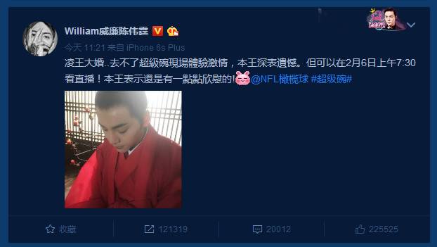 昨日中午球友君在陈伟霆的微博中看到了一个遗憾的消息:为了配合《醉玲珑》剧组几百人的统筹工作,陈伟霆不得不抱憾缺席超级碗。