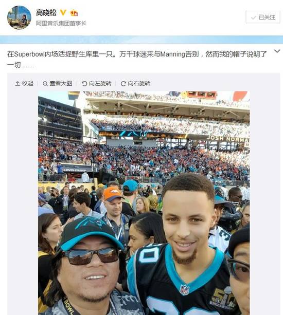 与王石一样,高晓松也是超级碗的拥护者,2016年高晓松在微博上晒出了“在Superbowl内场活捉野生库里一只”及照片,引来围观一片,以致猴年春晚躺枪遭遇网友吐槽“还不如高晓松晒的照片精彩”。