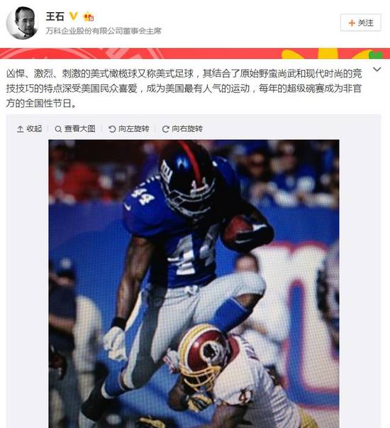 但也有一些中国观众,对NFL绝对是真爱。他们没有守在国内看电视,而是亲身来到现场,与超级碗零距离接触。地产巨头王石是美式橄榄球的忠实拥趸,不止一次在微博上普及橄榄球知识。2013年,王石就亲自到现场看过超级碗。