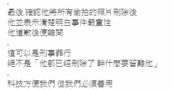 最后,柏豪确认个年轻人删除晒啲偷拍相,同埋佢知道个事件严重性后,就道歉后离开。柏豪贴文一出,好多网友都撑佢处理得好呀!