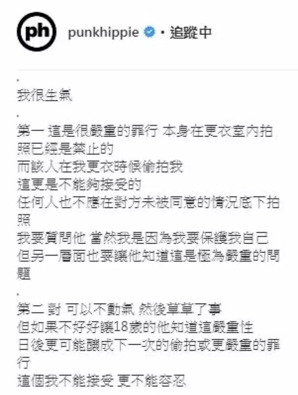 好似周柏豪咁,今日凌晨12时在Instagram撰文,佢上载一张相写住「请正视」,佢再留言话自己畀人偷拍,仲指对方系一个18岁嘅年轻人,柏豪当场捉住偷拍者,语重心长咁同佢讲:「你已是成年人,你要清楚知道自己能够做甚么,不能做甚么。」