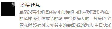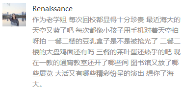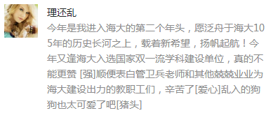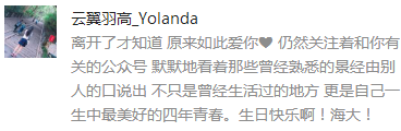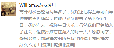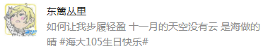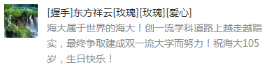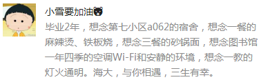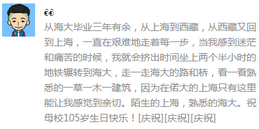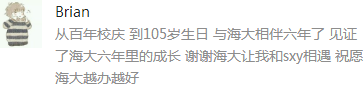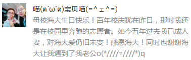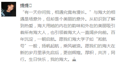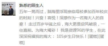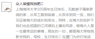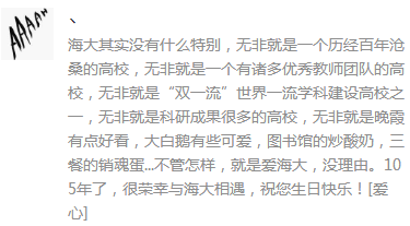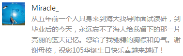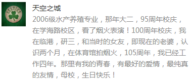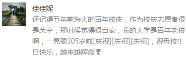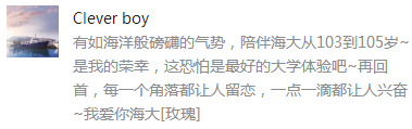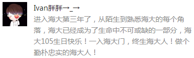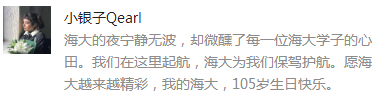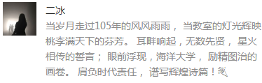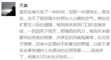 《我的海大,105岁生日快乐》发布那天,我们在后台收到了近千条的留言。每一条留言皆满带感动、自豪与期望,整理时一条条的看下来,不知不觉竟已泪目。相信我们的海大,拥有这样一群人的喜爱,明天一定会更加美好!