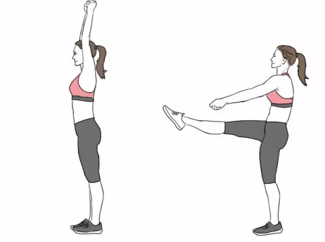 【做法】站姿,双手握拳举过头顶,保持手臂伸直。放下手臂置于身前,同时抬起右腿与地面平行。然后回到起始动作,换另一侧重复。