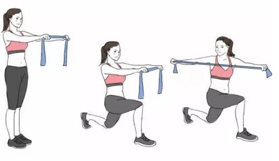 【做法】站姿,双手拉住拉筋带,与肩同宽。右脚弓步向前,左脚向后。接着,躯干扭转向右,尽可能将拉筋带拉伸到最大。然后回到起始动作,换另一侧重复。
