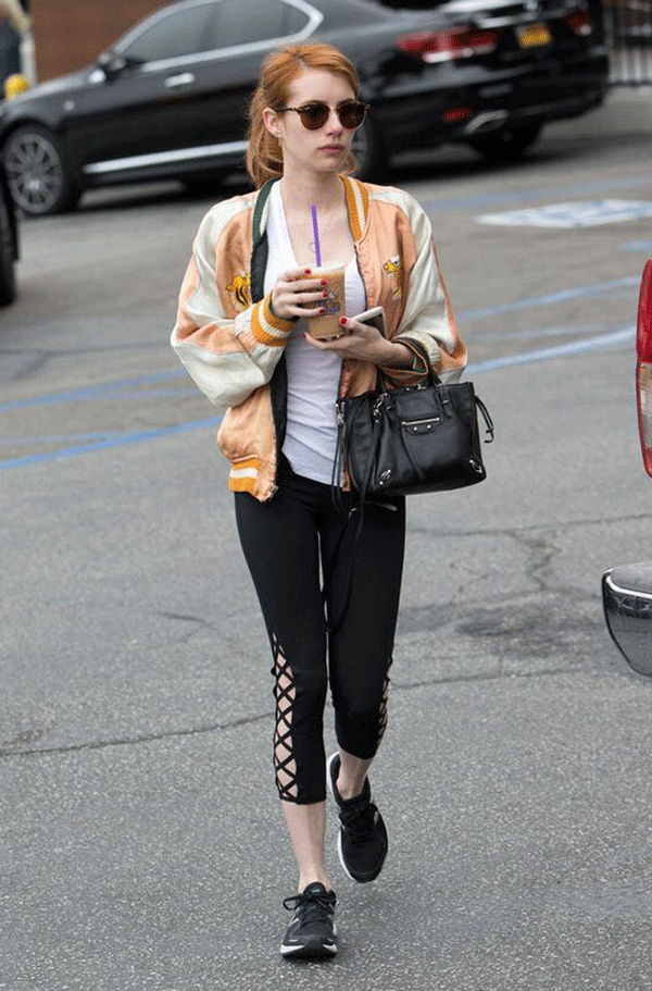 没有超模的傲人身高也一样可以将运动风引用的很好。比如艾玛·罗伯茨这样,以棒球外套搭配九分长的运动裤,将身体划分为最完美的黄金比,让迷你身高也能拥有维秘超模的大气场。