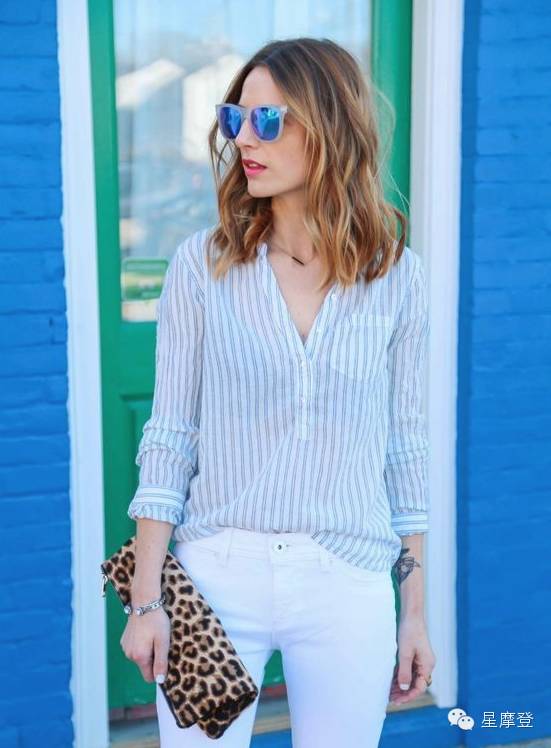 夏日里蓝白条纹的衬衫搭配一条小白裤就再完美不过了!比较有海军风的味道,在视觉上也减重不少~