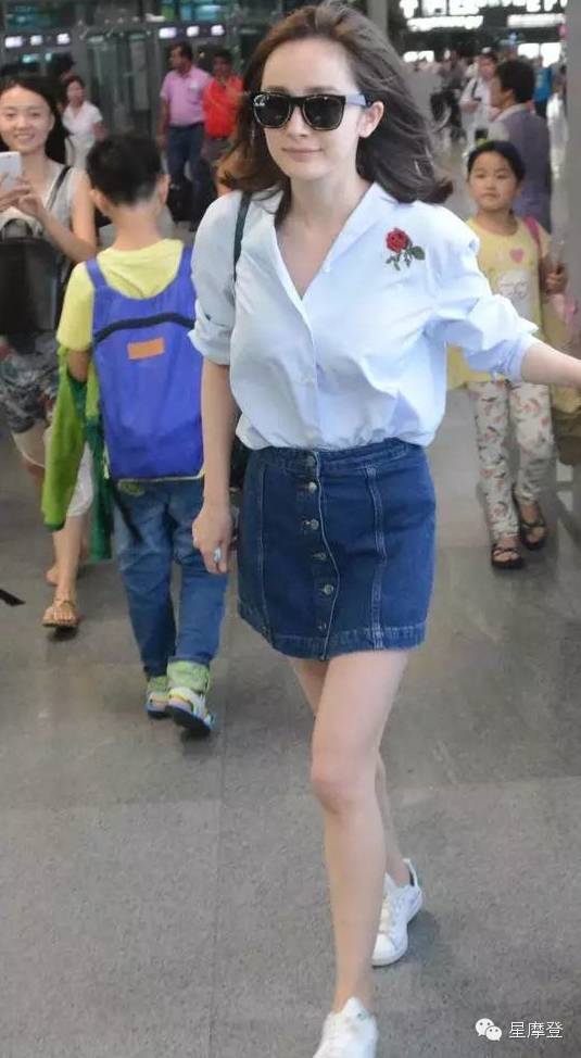 大幂幂穿的就是件浅蓝色衬衫哦,只是这件衬衫别具一格的在肩膀处有花朵刺绣图案,看起来非常精致。