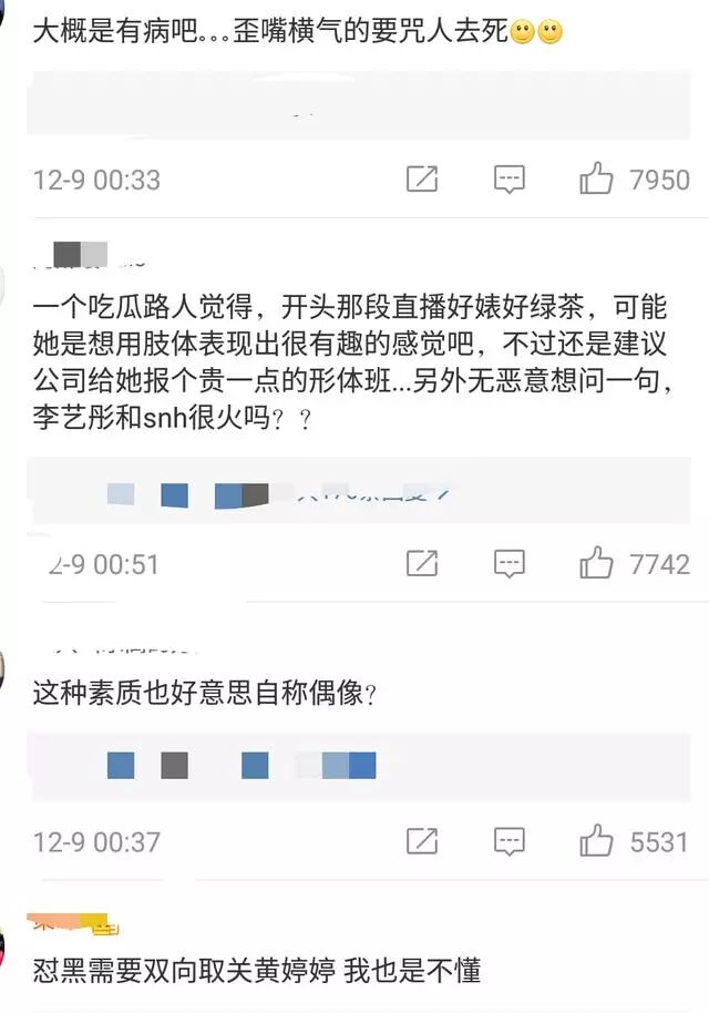 最近李艺彤要开生日会,表演曲目由粉丝花钱投票决定,于是李艺彤直播开火,首先谈及自己生日会的时候还是蛮激动蛮高兴的,然而在听说有粉丝要给李艺彤和黄婷婷这对“卡黄CP”投一首合作舞曲《人鱼》的时候,李艺彤瞬间就火了,多次强调自己差点爆粗口,但考虑到自己自己个人素质以及未来发展忍住了,最后还忍不住诅咒给自己集资投票的黑粉们全部都炸成一朵烟花……