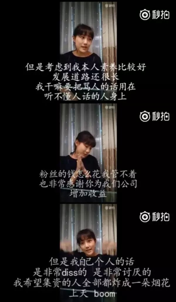 还算了一下粉丝给自己投一百票要花1400,特别不屑地语气表示“切,一千四,老娘衬衫都不止这点钱,可笑,连我一件衬衫都买不起”