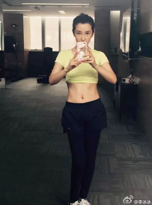 李冰冰曾在微博上晒出一组健身照,并留言称:“外面打雷下雨我在挥汗如雨”。