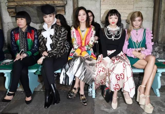 未来感十足的金属色百褶裙+印花缎面拼接针织衫,手拿Gucci新一季包包,脚踩Gucci最受欢迎的珍珠高跟鞋,孔孝真这一身混搭你们给几分?