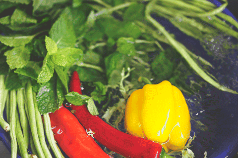 ▲据说这堆菜叶子里包着一个印度三角饺,馅儿是蔬菜腰果和椰子碎。