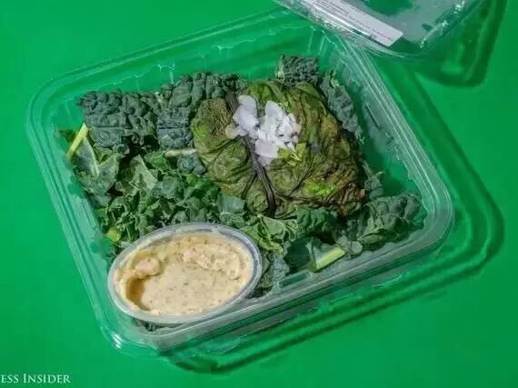 午餐:一堆生的绿叶菜+一个印度萨摩萨三角饺+一包蔬菜干+一瓶水