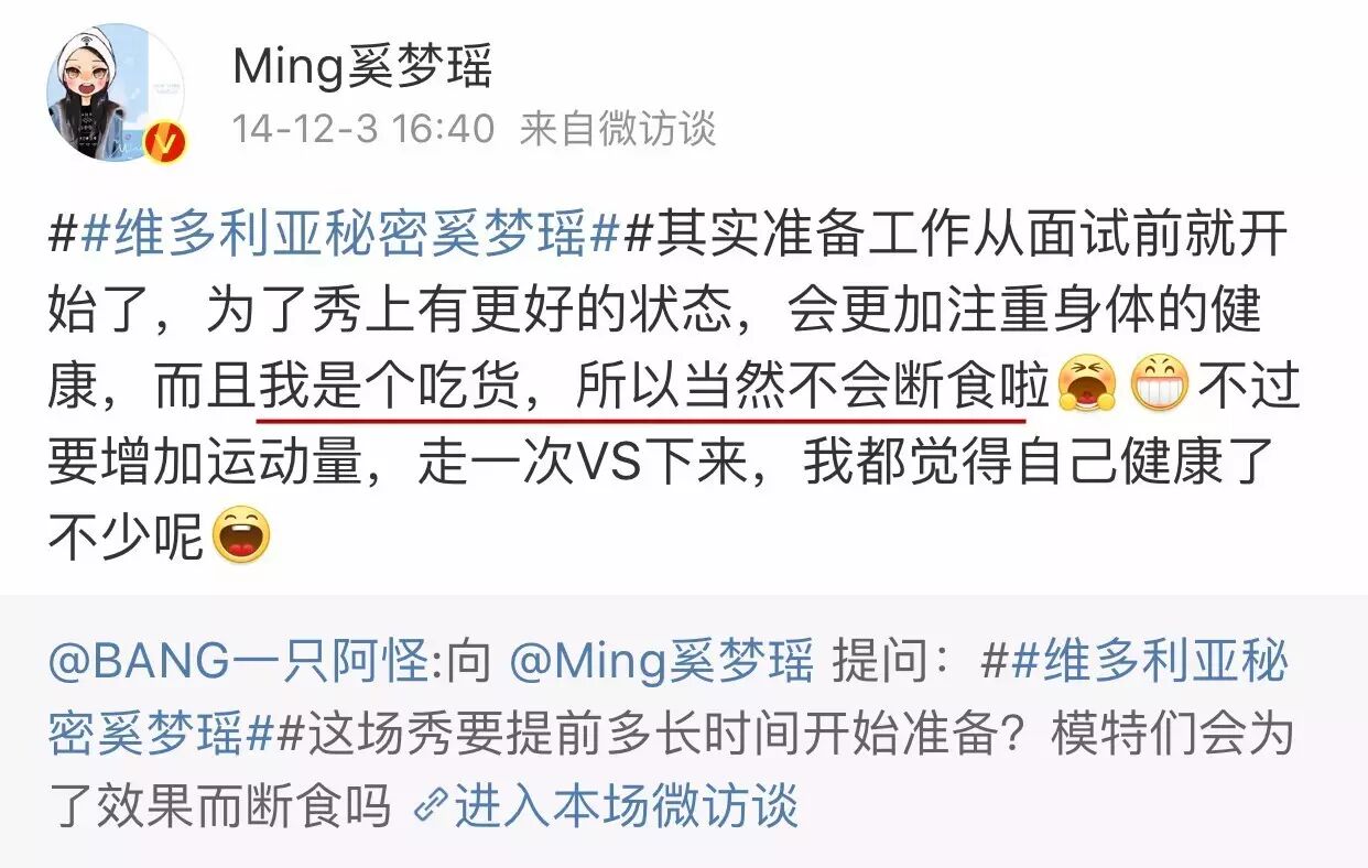 奚梦瑶:如果能给别人做参考当然好啦,要忌口是难受,但是想到要在T台上呈现出的形象,就哭着忍住了(大笑)。