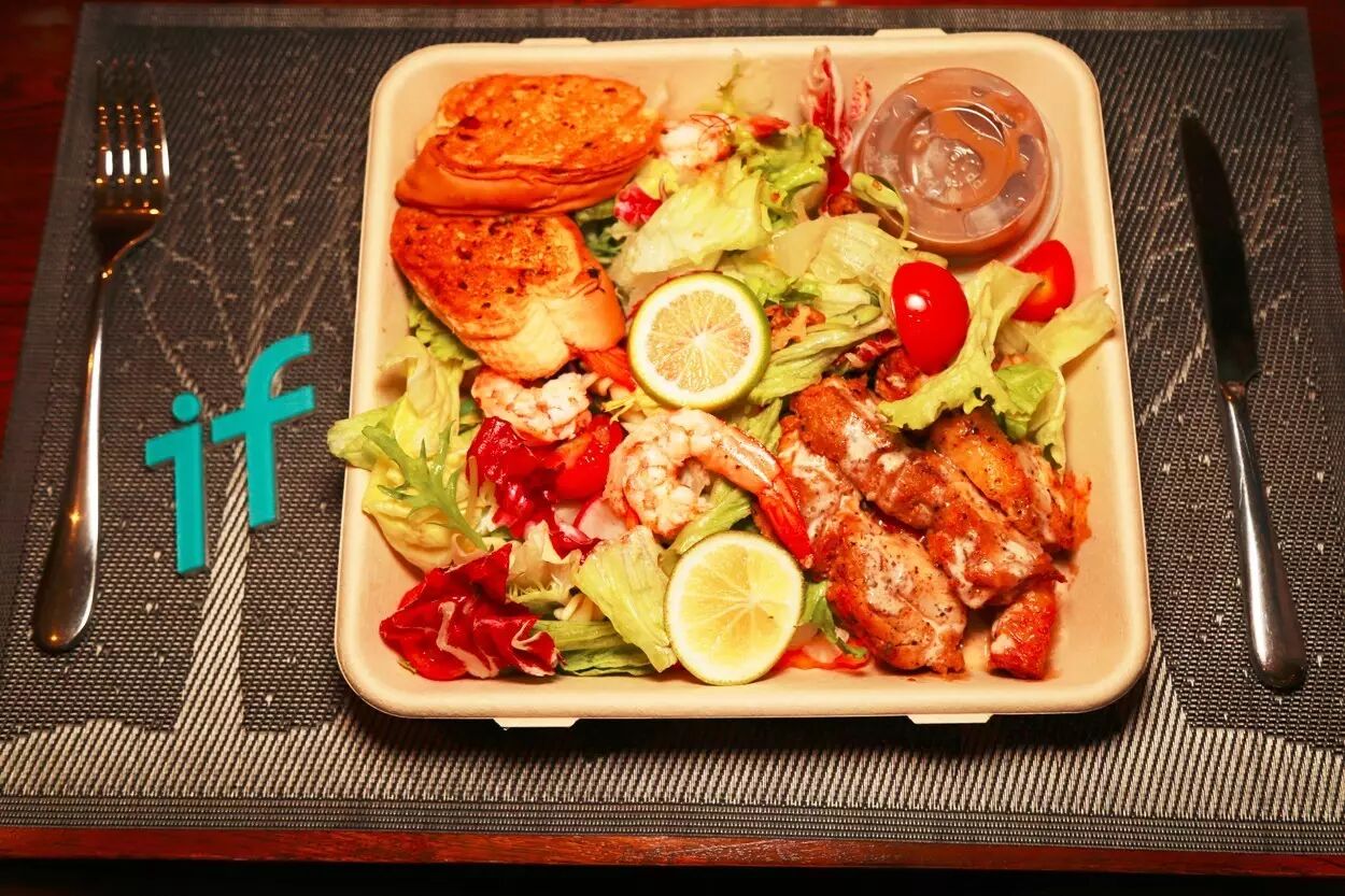 成分包含:生菜,紫甘蓝,圣女果,烤虾和鸡腿肉,主食是两片涂了橄榄油的烤面包。