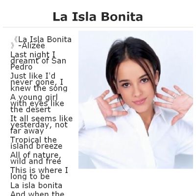 « L a I s l a B o n i t a » ئامېرىكا مودا ئايال ناخشىچىسى مادوننا سىكونى ئېيتقان مودا مۇزىكا مۇزىكىسى بولۇپ ، ئاھاڭ نوتىلىرىنى پاترىك لېننارد ، برۇس يازغان ، مادوننا سىكونى كېيىنكى ناخشا - مۇزىكىلىرىنى ئۆزگەرتىپ يازغان .