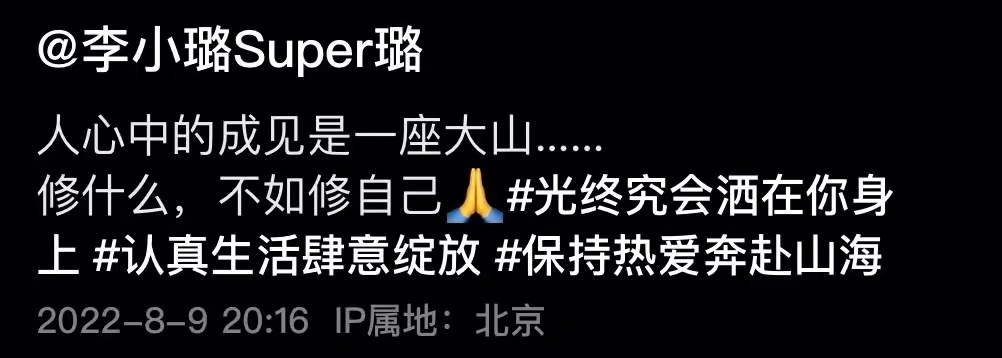 李小璐疑擦边“佛媛”被批:别装了,醒醒吧! 阿何有话说 内地女星 2022-08-25 15:00:22 360 创作不易,用心坚持,欢迎请BaGua喝几杯爱心咖啡!打赏并支持本文 打赏并删除本文 作者 | 咖姐来源 | 云音咖(ID:CM2Lab)前几天,消失许久的李小璐更新了自己的状态。那是一组照片,拍摄自云南西双版纳的曼听公园,寺庙与佛像林立,颇具民族气息。李小璐穿梭在各色建筑间,与背景融为一体。美人美景,十分养眼。一如往日的风格,李小璐的穿着十分性感。作为一位年逾40的母亲,李小璐身上依然散发着少女感,实属难得。也许是为了配合建筑特色,也许是为了彰显虔诚。在一张照片中,李小璐紧闭双眼,双手合十,做出祈祷的模样。但在另一张睁眼的照片中,她的眼神又显得分外撩人。在这一组照片中,李小璐还专门配上了一段文字:“人心中的成见是一座大山……修什么,不如修自己。”这段话从李小璐口中说出,就变得有些意味深长。不知是想和过去几年的阴霾一刀两段,亦或是想驳斥网络上对她的挖苦讽刺。但不出意外,李小璐这些照片经过流传和发散,就引起了新一轮的争议。很多人批评李小璐,说她在寺庙里穿着太过暴露,是对他人信仰的亵渎。有去过西双版纳的网友,说那里的一些佛教建筑,是不允许穿着暴露的女生进入的。总而言之,对李小璐嘲讽批评的声音,占据了绝大多数。甚至有不少人,直指李小璐本就是去摆拍作秀的。“她心中哪有佛,是在撩人。”各个地方都有自己的风土民俗。要是喜欢跟团旅游,那你一定听导游说过各种风俗禁忌。而某些地方的风俗,就是特别敏感。且不说这些风土民俗合理与否,但作为外来者,首先应该要学会尊重。话虽如此,但也有“不知者不罪”一说。实际上拍照本就是许多人,尤其是女孩子,外出旅行必要的一环。就李小璐的情况而言,她所穿的衣服是当地一种“表演服”,是专门租给外地游客拍照用的,只不过不能穿进寺庙。而李小璐拍照的位置,也很难说究竟是寺庙内还是寺庙外。其实李小璐的问题,不在于穿着如何,而在于其配字。如果她只是发自己去西双版纳游玩的照片,恐怕根本不会有什么争议。可她偏偏专门写了个“修行”,就更显得动机不纯。“修行”这么严肃的词,跟李小璐的穿搭只能说是格格不入。因此被质疑,自然也就见怪不怪。但经过了“那件事”的李小璐,恐怕早对这些不以为意了。自从“做头发”之后,李小璐似乎就和“坏女人”这一标签绑定了。好巧不巧她还正赶上了对“出轨”愈发不能容忍的时代,导致其几乎在一夜之间,就淡出了娱乐圈。但要说李小璐因此一蹶不振,倒也未必。至少从表面上看,她过得反倒更加潇洒自在。偶尔也会发一点自己rap的视频。作为曾经的专业舞者,依然保持着练舞的习惯。而且她的排场,也不是一般的练习生、爱好者能媲美的。动辄找来一帮专业伴舞,复刻经典MV。至于私生活,也是惬意非常。分享的日常,从一家三口的生活,变成了和女儿的日常。还会带着女儿一起跳舞,共同出镜。时不时又爆出点绯闻,和小鲜肉约会,她也不会再去费劲解释。毕竟已经单身,跟谁在一起完全是个人自由。如果没有“坏女人”的标签,李小璐的状态大概是一个单身妈妈最好的样子。甚至可以说是大部分女生,梦寐以求的生活。不用被身份束缚,不用为现实发愁。自由自在,率性而为。想来也是,李小璐之前也曾红遍大江南北,最差的时候也算是二线明星里的顶流,收入自然是不用愁的。现在说是淡出娱乐圈,未必不能看作是退休。有钱又有闲,自我实现就变得相当容易。奈何李小璐“退休”并非本意,是犯下的错被公开审视后的代偿。这就显得她的岁月静好中,藏了一抹刻意表演的味道——一如她口中的“修行”。人生太漫长,容错却不高。像是出轨这种事,只要有一次,几乎就能给一个人的品行打上不堪的烙印。这件事本就容不下侥幸,听不见理由。事情败露了,想要跨过“道德审视”这道坎也是不容易的。必须得像《许三观卖血记》里那样,有为生活所迫的无奈妥协,或是得有某些时代背景作为掩盖。然后得出个自欺欺人的结论,在得过且过中走完一生。说到底,有些错误是不能犯的,尤其是涉及到道德底线。而当这种错误的载体是明星,就会被放大到极夸张的地步。比如现在我们看到李小璐,恐怕早已忘记了她叱咤风云的前半生,只留下那个关于污点的记忆。我们经常说,李小璐“一副好牌打得稀烂”,但这也属于旁观者视角。从李小璐自己透露出的细节来看,可能她本就觉得自己的人生充满了无奈。首先比起艺人,她一定更渴望舞台。唱歌跳舞组女团,成为聚光灯下最靓的仔。其次在舞台上,她也更喜欢rap嘻哈,狂放不羁展现自我。就连上个综艺也要扎个脏辫,找机会秀一把rap:“我每天不仅工作,还要照顾甜馨,大家叫我比较酷的李小璐!”结果她最后却和“好好先生”人设的贾乃亮走到了一起,很难说到底是日久生情,还是利益交换。所以她从贾乃亮,走向pgone,并不是一场意外。哪怕没有pgone,也大概率会有其他人。而这也决定了李小璐悲剧发生的必然。正如之前所说,李小璐的“退休生活”看似美好,却更像是一种无奈之举。她转型成了网红,直播带货第一天效果斐然。媒体起了个惊悚的标题《李小璐直播四小时狂赚2000万》,搞得不知道的还以为李小璐事业焕发了第二春。实际上当天到李小璐直播间的,大