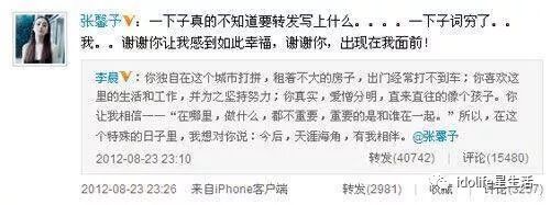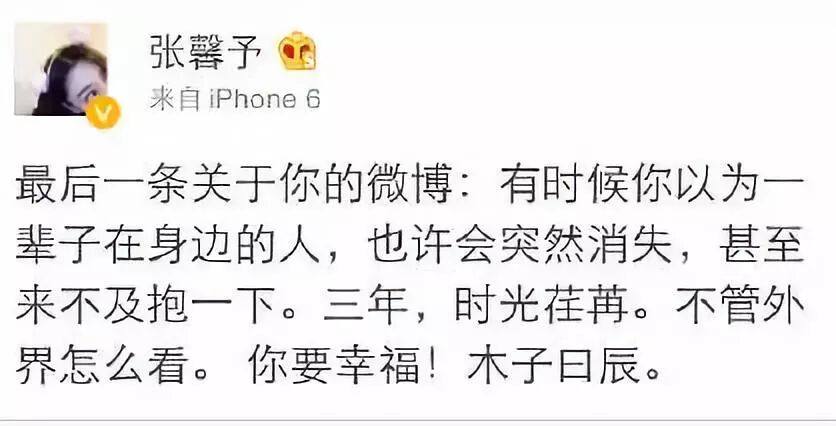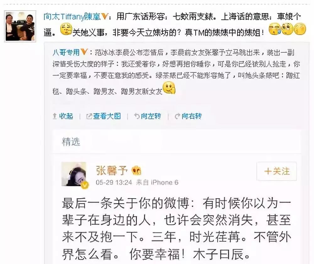 而后两人分手后,李晨又以“我们”宣告与范冰冰的恋情。这个时候,前女友张馨予发了“最后一条关于你的微博”。