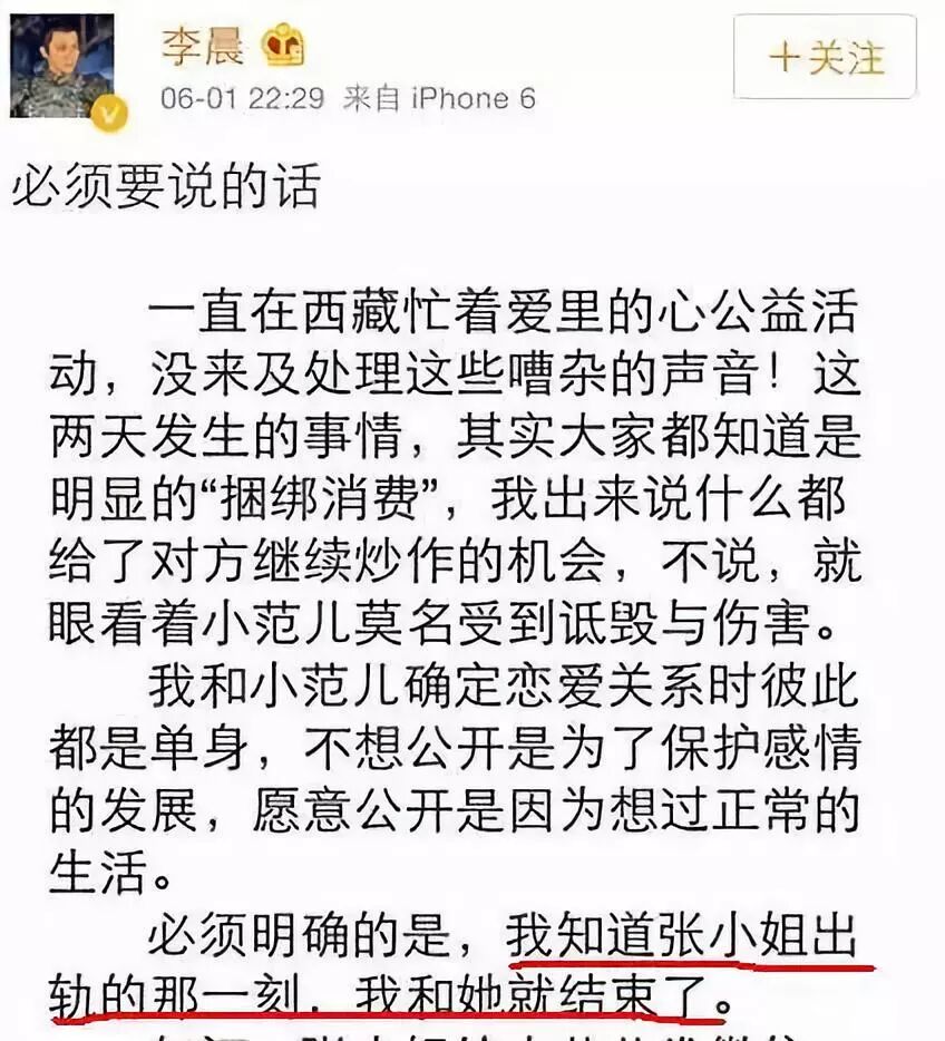 在大家议论纷纷的时候,李晨终于坐不住了,连夜发微博否认范冰冰插足,并直指张馨予出轨。