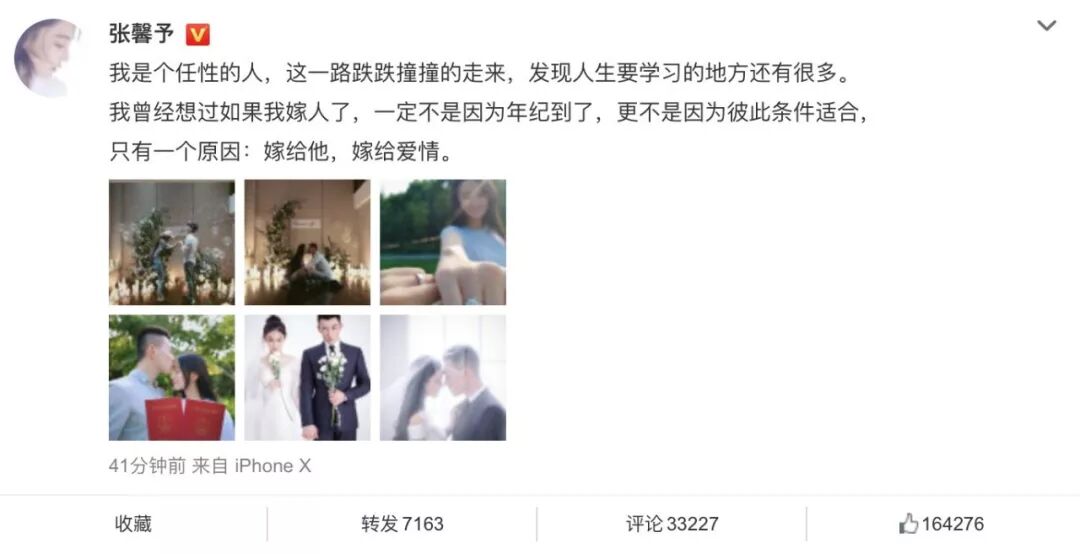 她发了一条微博宣布结婚,并表示自己这次嫁给了爱情!