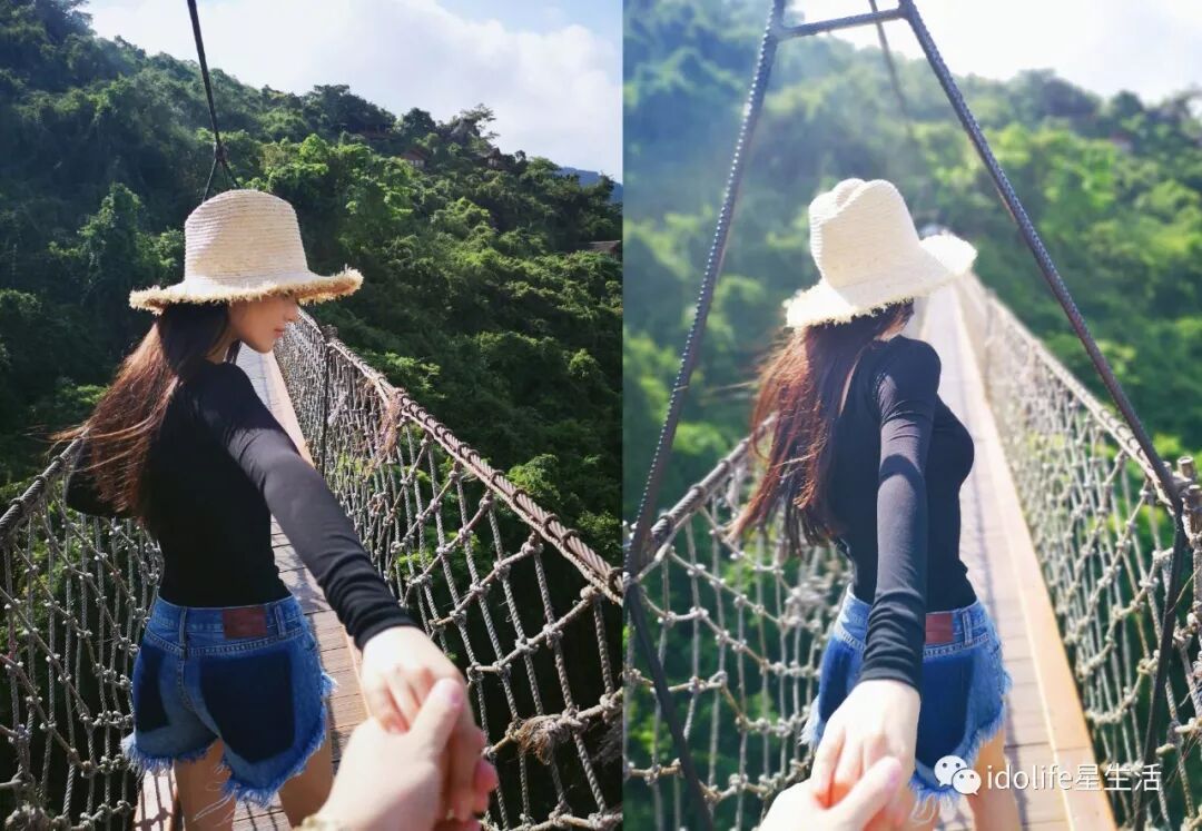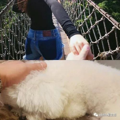 张馨予po的两张照片背景是一座吊桥和森林,巧的是何捷5月20日发的心状云朵图中也有类似的吊桥和森林